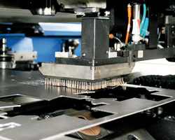 Der CO2 Laser mit 2.400 Watt eignet sich besonders für grad- und oxydfreie Schnittkanten, während bei gleicher Geometrie die Stanzbearbeitung dem Laser überlegen ist. Desweiteren können in einem Arbeitsgang Umformungen, Kiemen und Senkungen erfolgen.